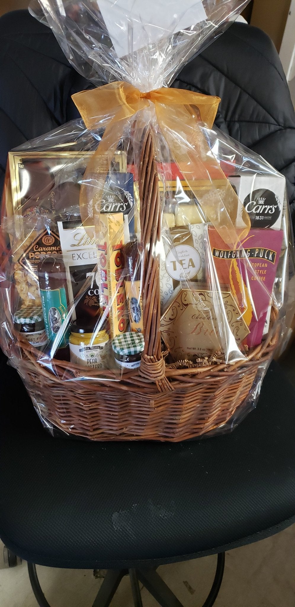 A basket filled with delicious gourmet chocolates, cheese, crackers, jelly, mustard, sausages, coffe, tea, chocolate coverd oreo's, chocolate covered pretzels, handmade toffee crunch, caramels, Lindt chocolate bar, Toblerone chocolate bar and a box of Godiva chocolates